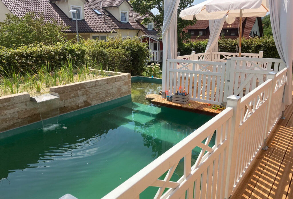 Hier prägt Wasser die Stimmung: Ein kleiner Schwimmteich bringt Bewegung und spiegelt das Licht in den Abendstunden.